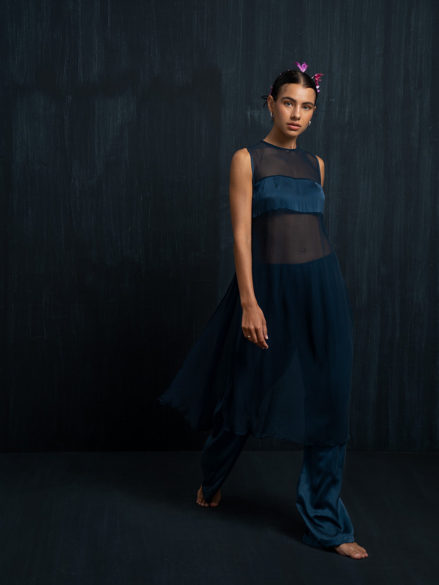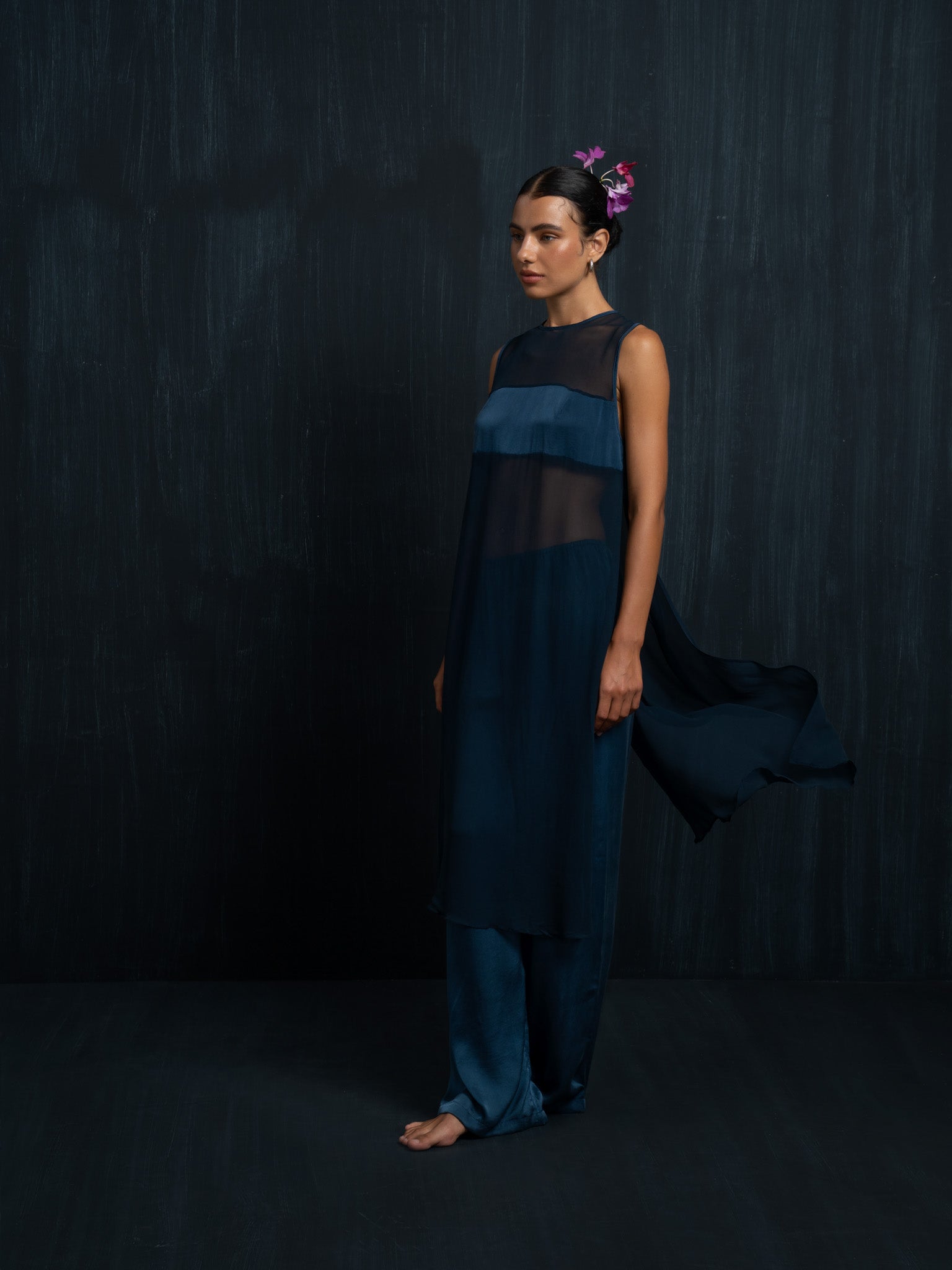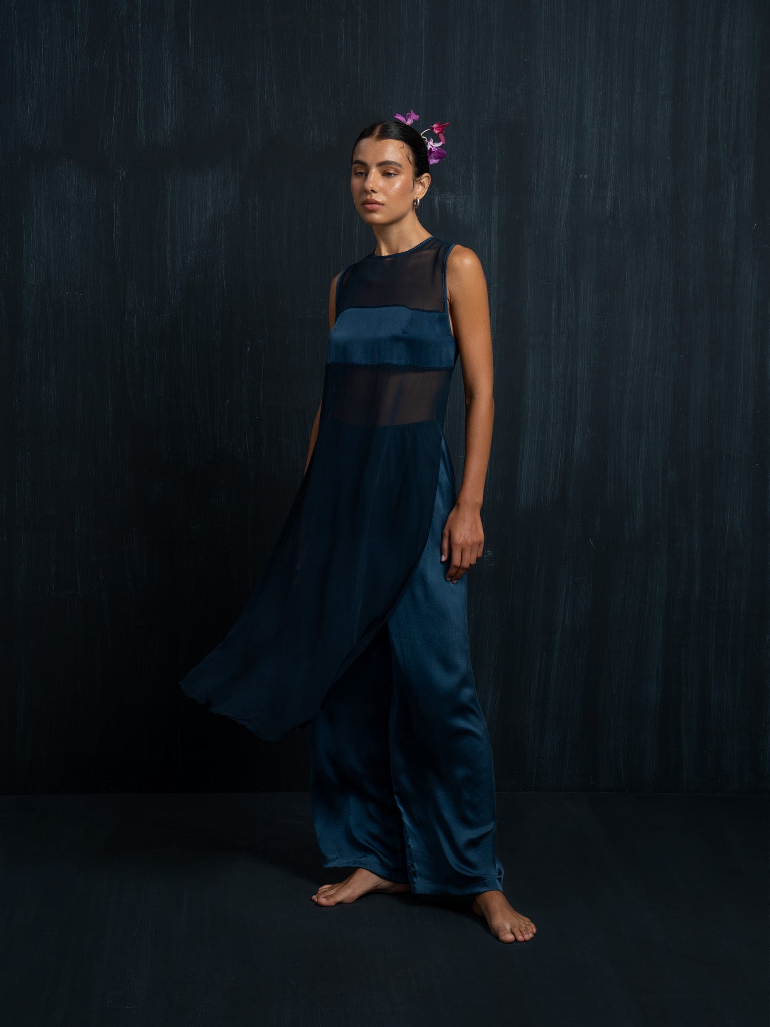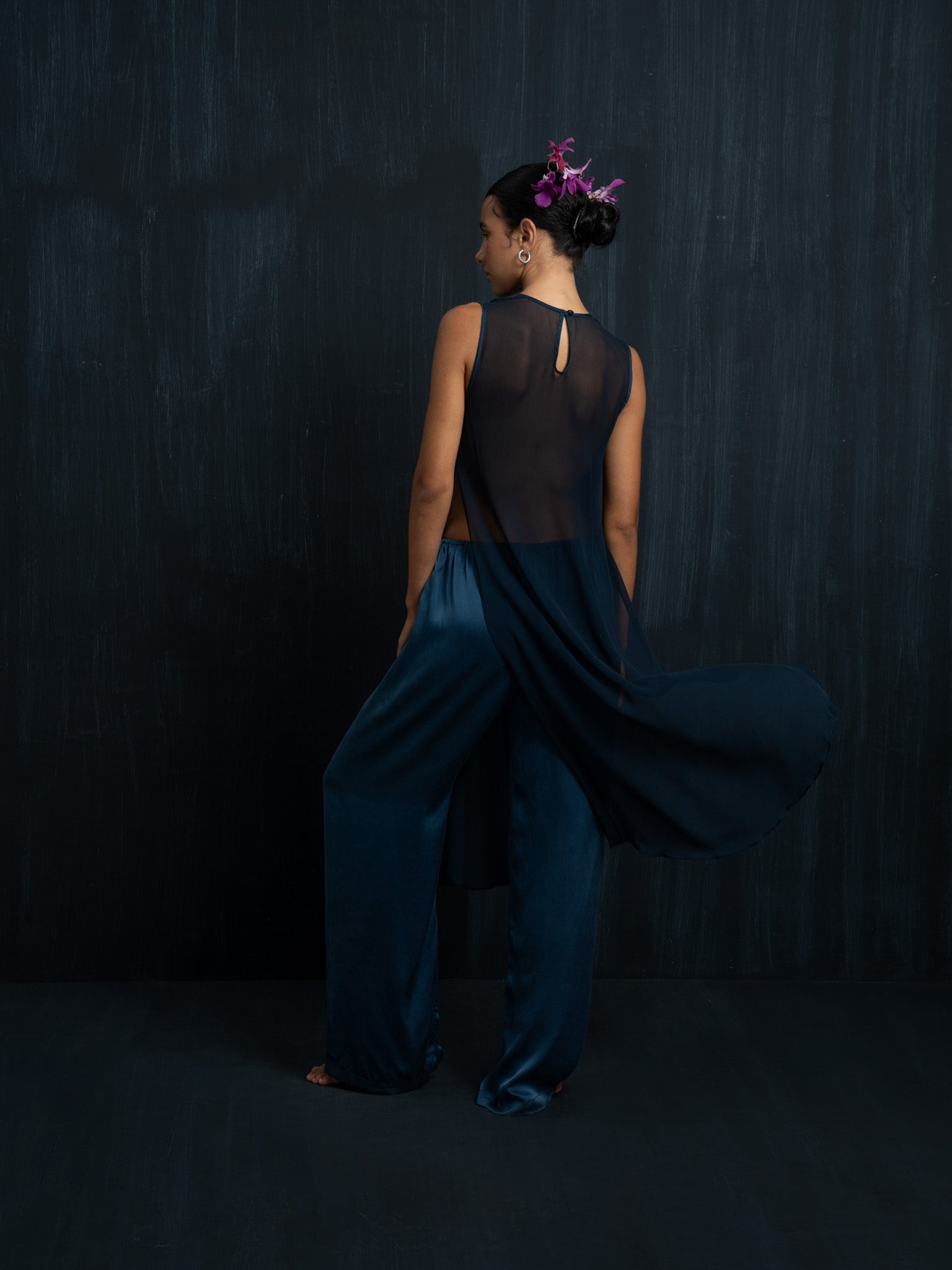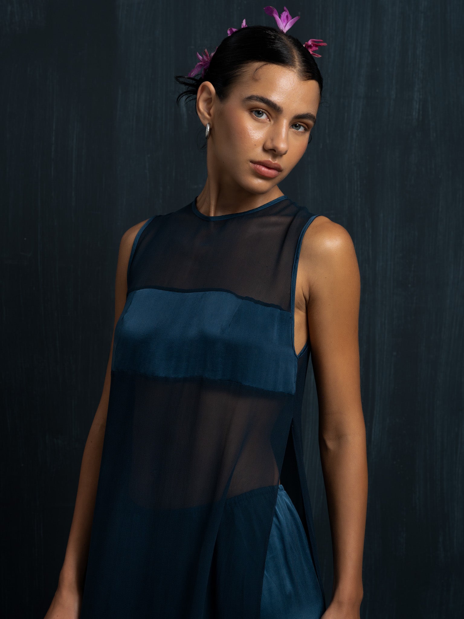 This midi-length silhouette flows effortlessly, with high open slits that create soft movement with every step. The sheer indigo chiffon is contrasted with deep blue silk satin details at the neckline and arms, adding depth and subtle structure to the otherwise airy design. A single mother-of-pearl button closes the back, finishing the piece with a quiet, refined touch.