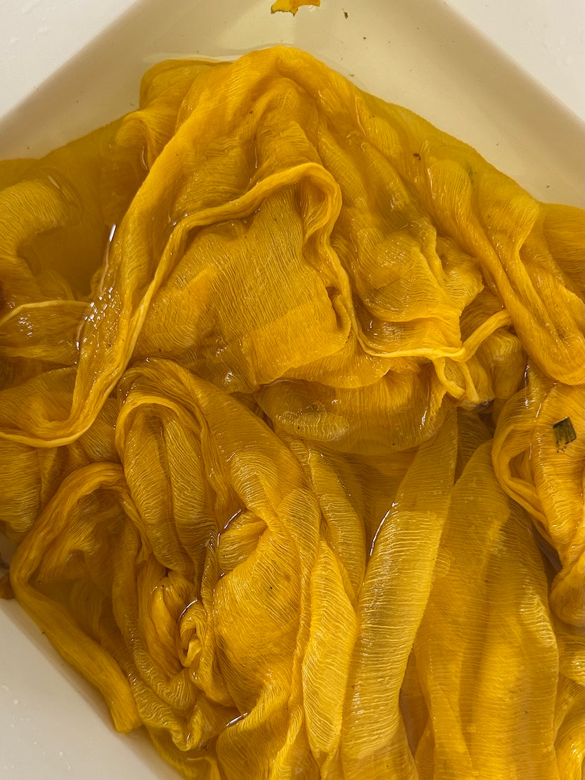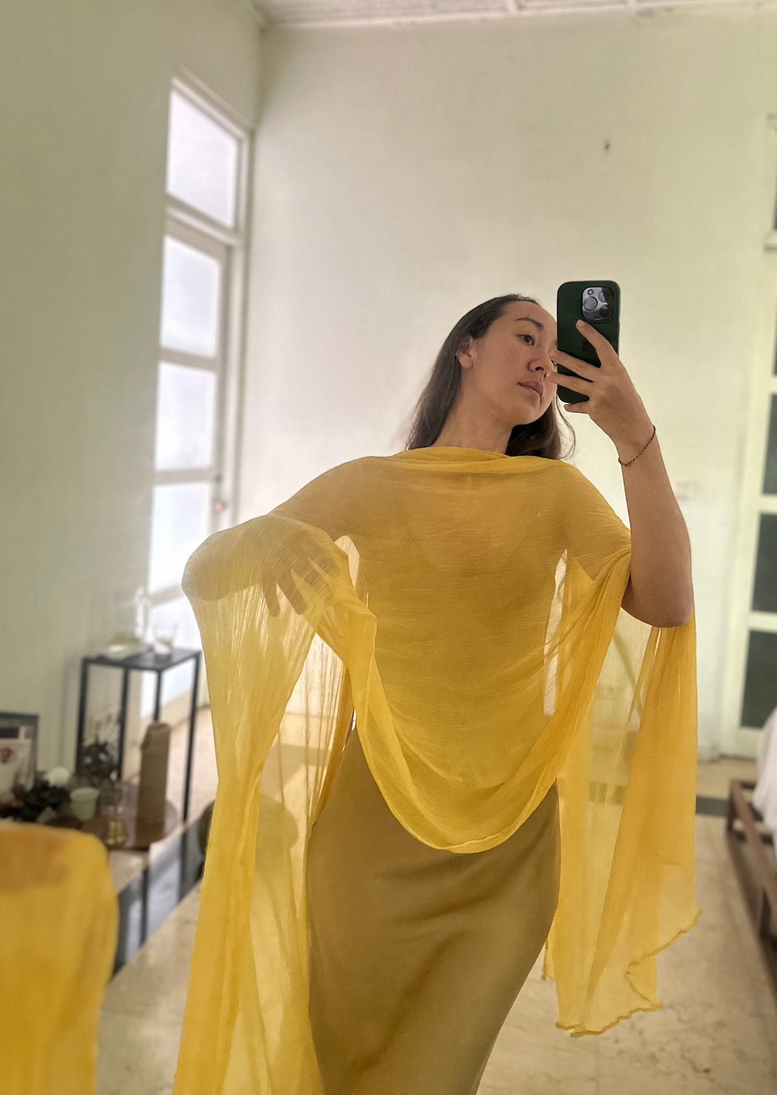 Handcrafted from 100% pure mulberry silk and naturally dyed with real marigold flowers, this scarf drapes the body like a gentile companion. Sheer, feminine, and luxurious, it moves like water, wrapping the body in a soft golden glow.