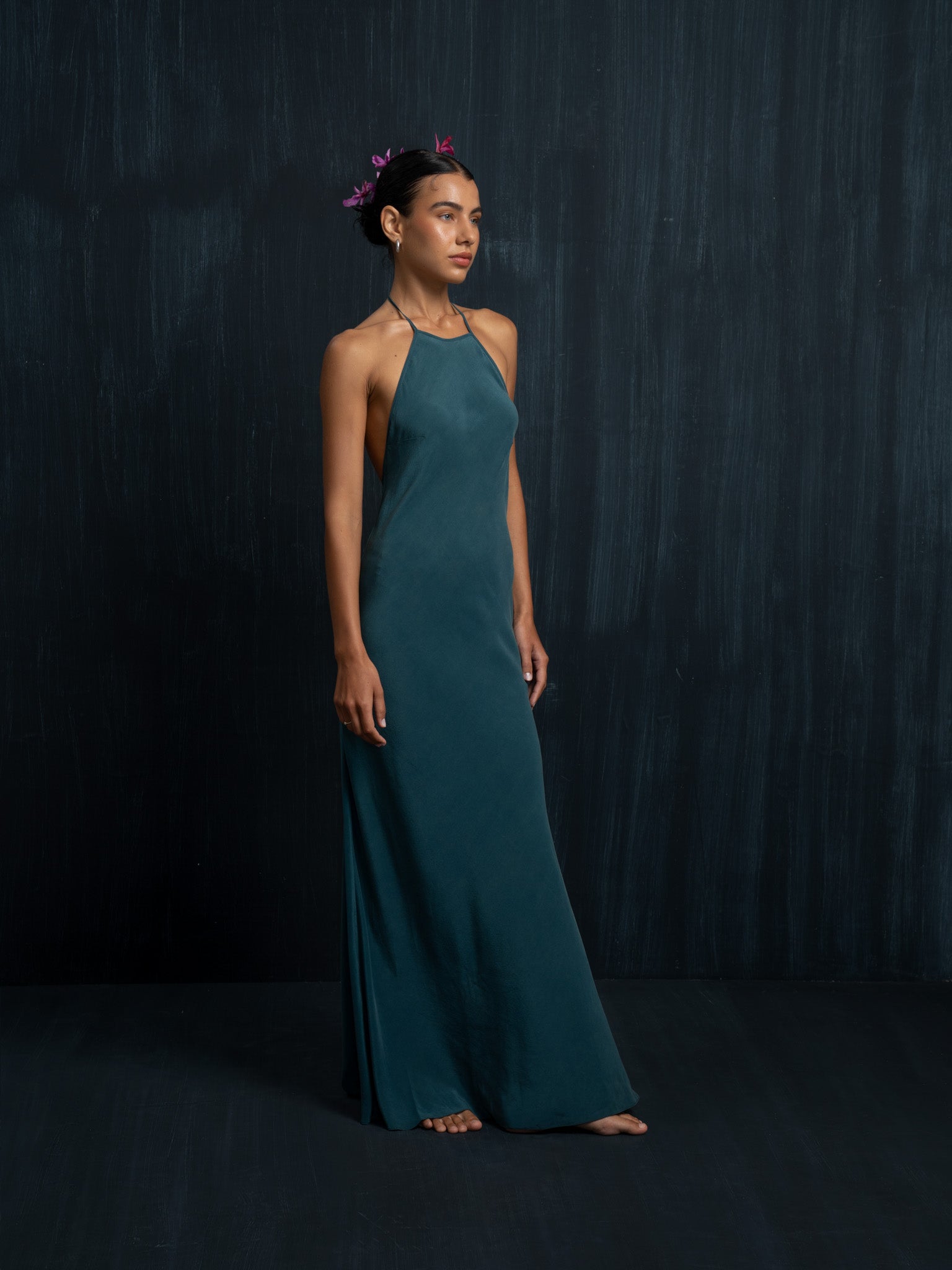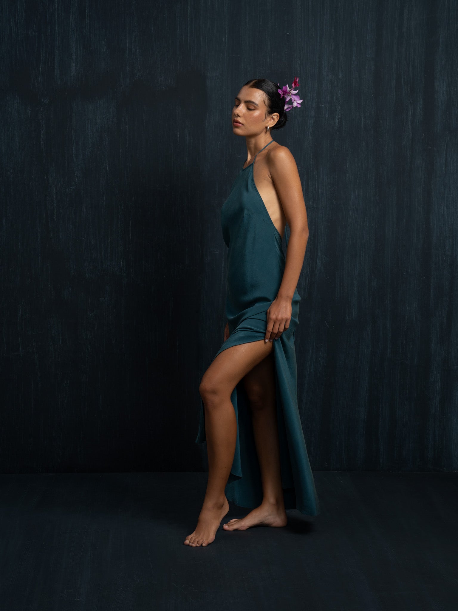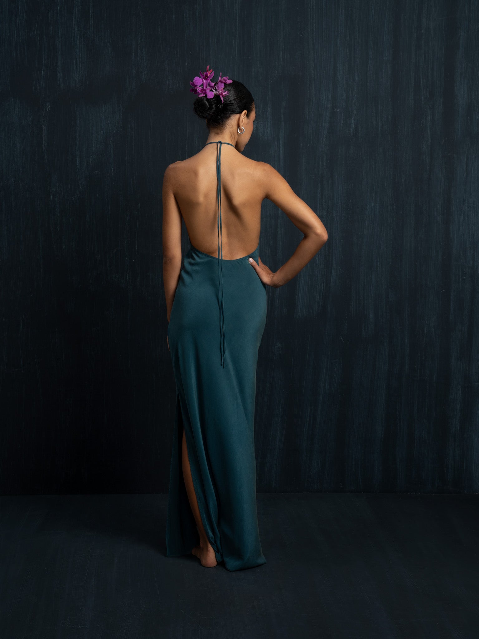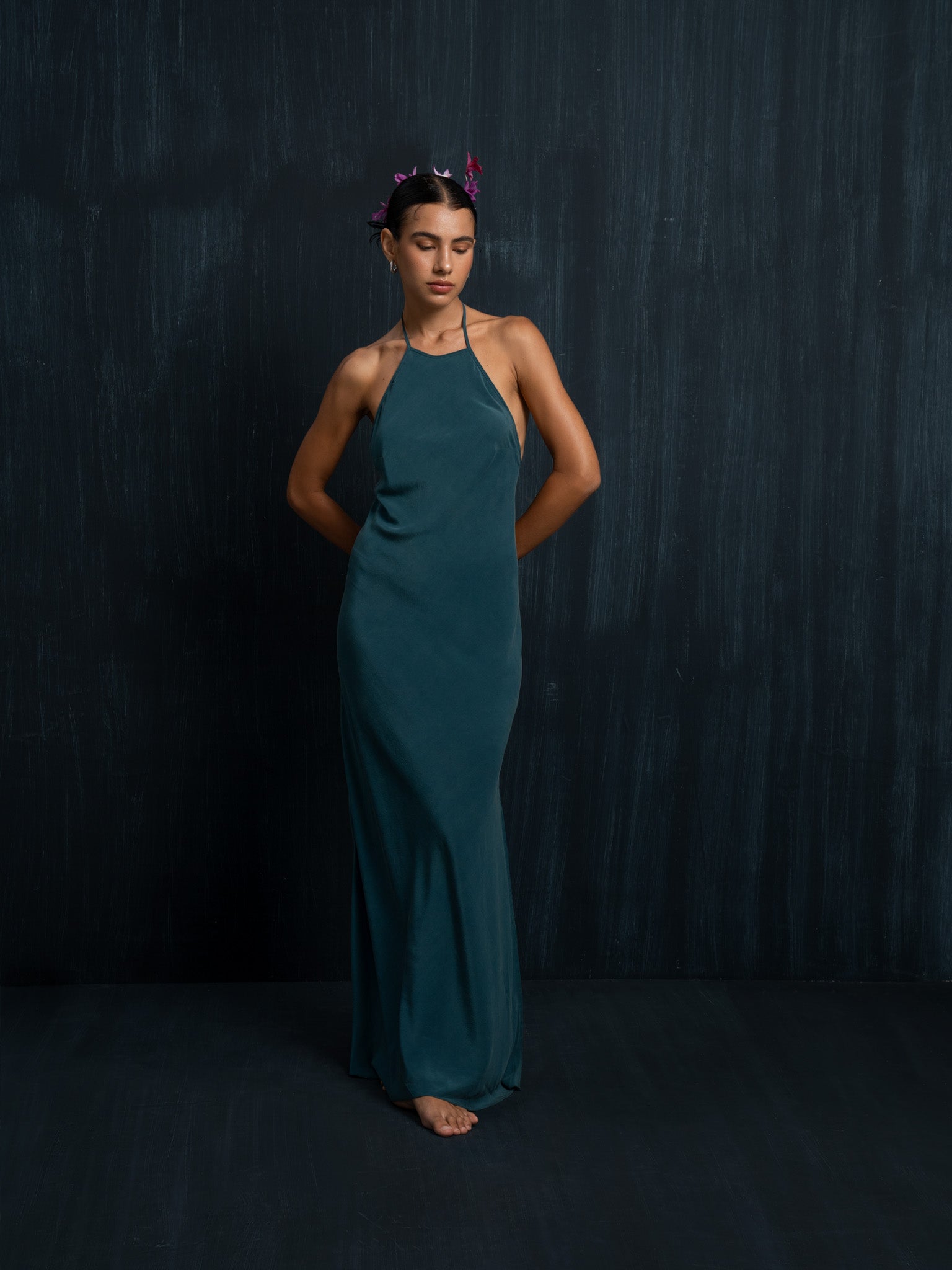 Our Mila Silk Dress is cut on the bias at a 45-degree angle, enhancing the natural stretch, movement, and flexibility of the silk fabric. Crafted with a classic and timeless silhouette in mind, our Mila Silk Dress features a halter style neckline, a low back, adjustable back ties and a moderate high slit. Designed with darts under the bust to create a beautiful shape from the front. The waist is subtly defined, while the plunging back is the ultimate of statements. The floor-length, maxi design, gives the overall look an elegant, flowy and feminine sensibility.