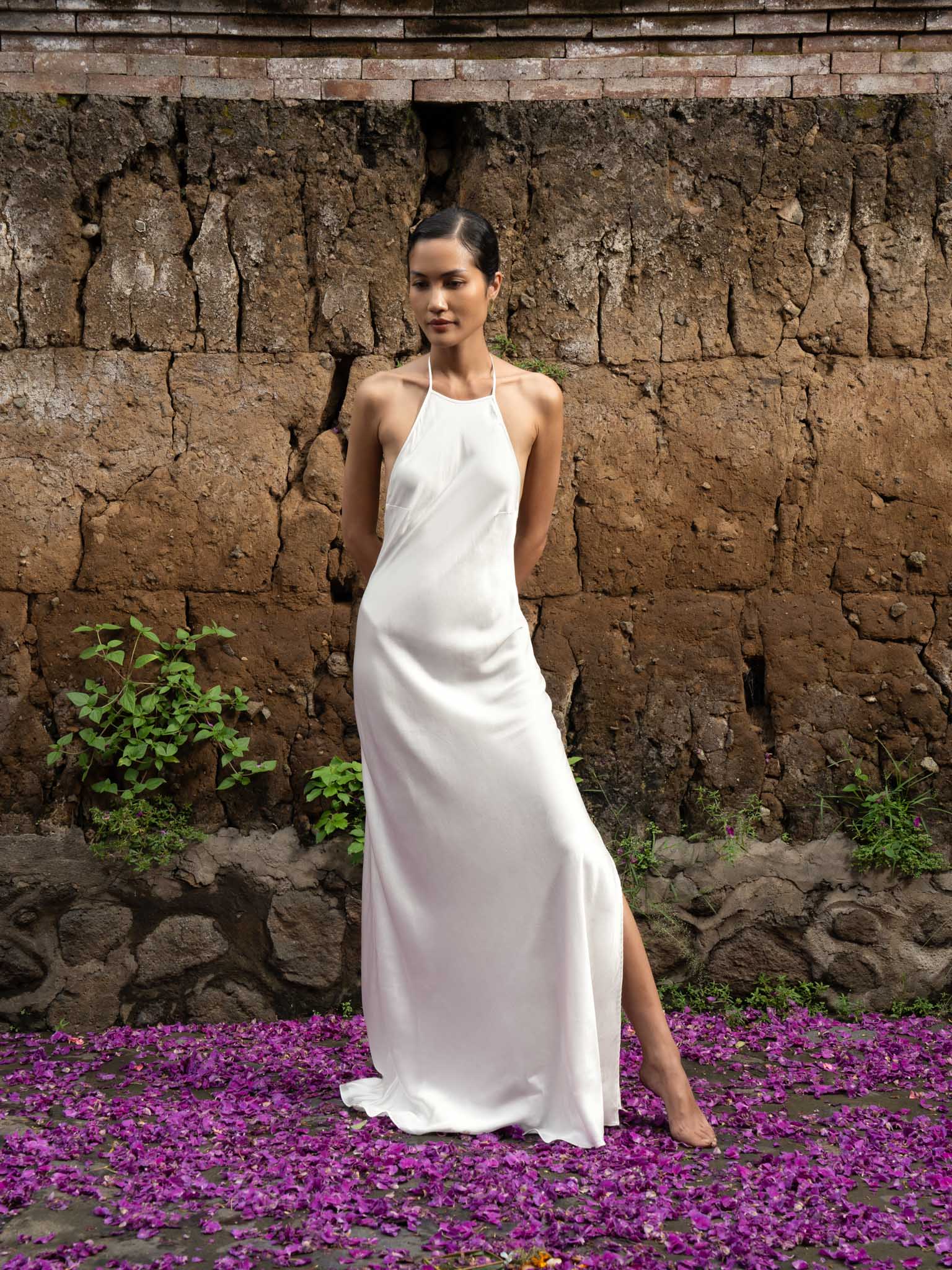 Crafted from 100% genuine mulberry silk, our Mila Halter Silk Dress in Ivory, is the perfect bridal party dress. Suitable for simple wedding ceremonies or an after-party dress.