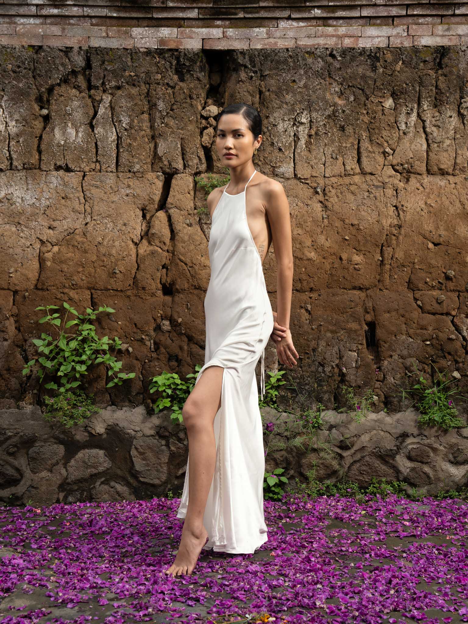 OUR MILE HALTER DRESS IN IVORY, IS LINED WITH A LIGHTWEIGHT COTTON. The lining eliminates any unwanted see-throughness and conceals any visible seams from your undergarments. The added lining to our Mila Halter Dress, also adds desirable weight to the dress, giving the dress a luxury, polished and seamless drape.