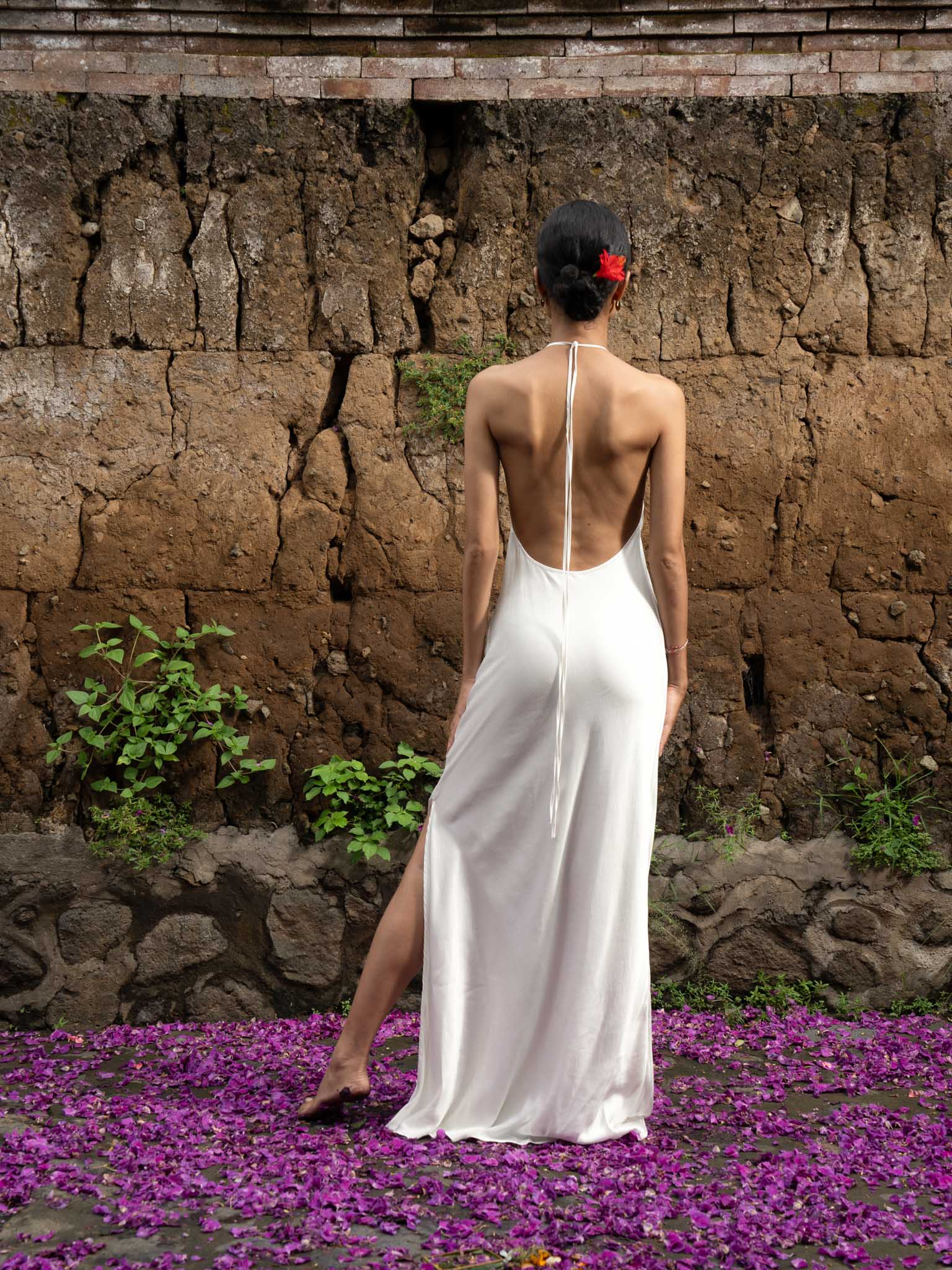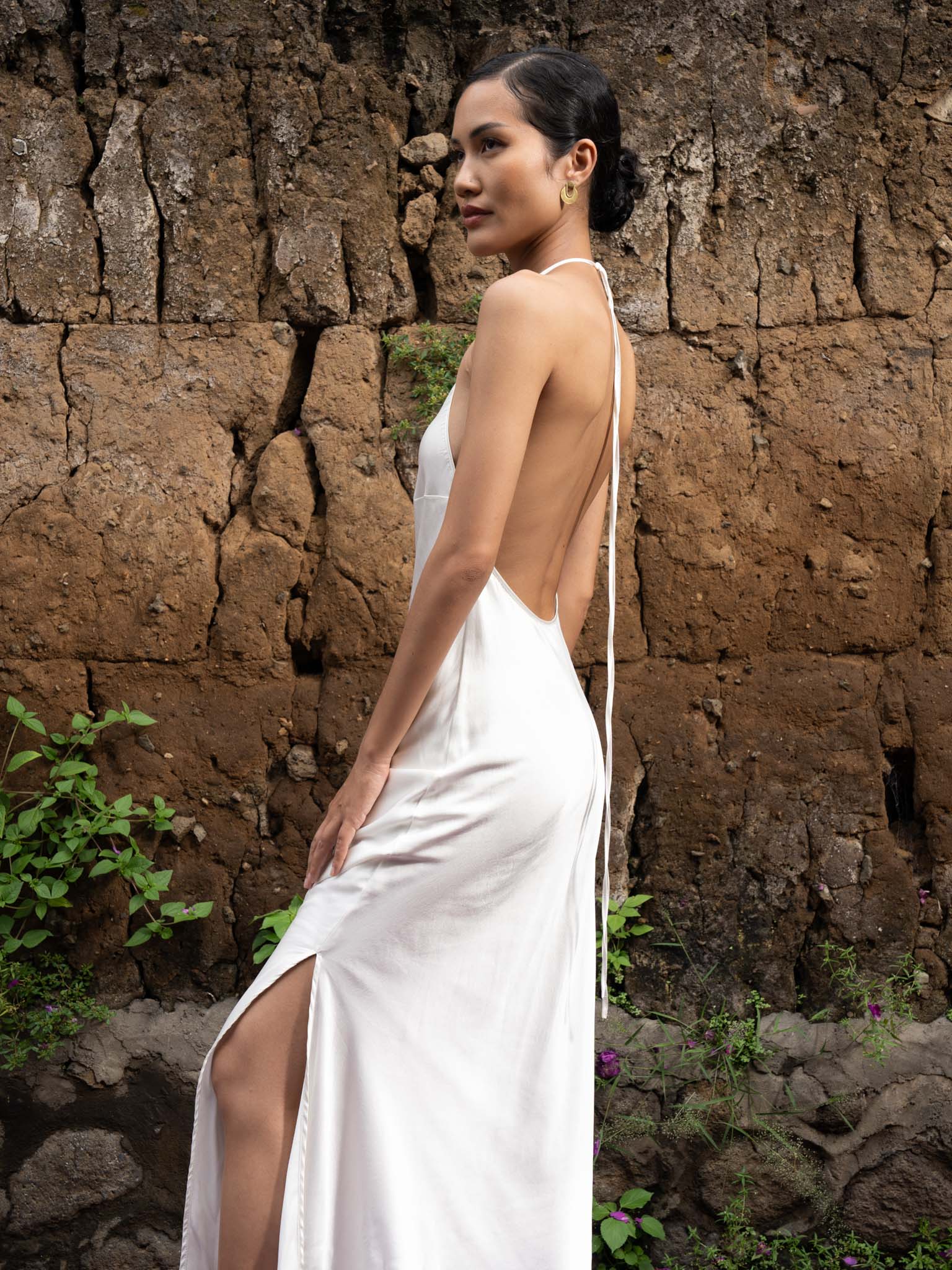 Our Mila Silk Dress is cut on the bias at a 45-degree angle, enhancing the natural stretch, movement, and flexibility of the silk fabric. Crafted with a classic and timeless silhouette in mind, our Mila Silk Dress features a halter style neckline, a low back, adjustable back ties and a moderate high slit. Designed with darts under the bust to create a beautiful shape from the neckline. The waist is subtly defined, while the plunging back is the ultimate of statements. The floor-length, maxi design, gives the overall look an elegant, flowy and feminine sensibility. Keep your accessories to a minimum and let the dress be the statement piece.