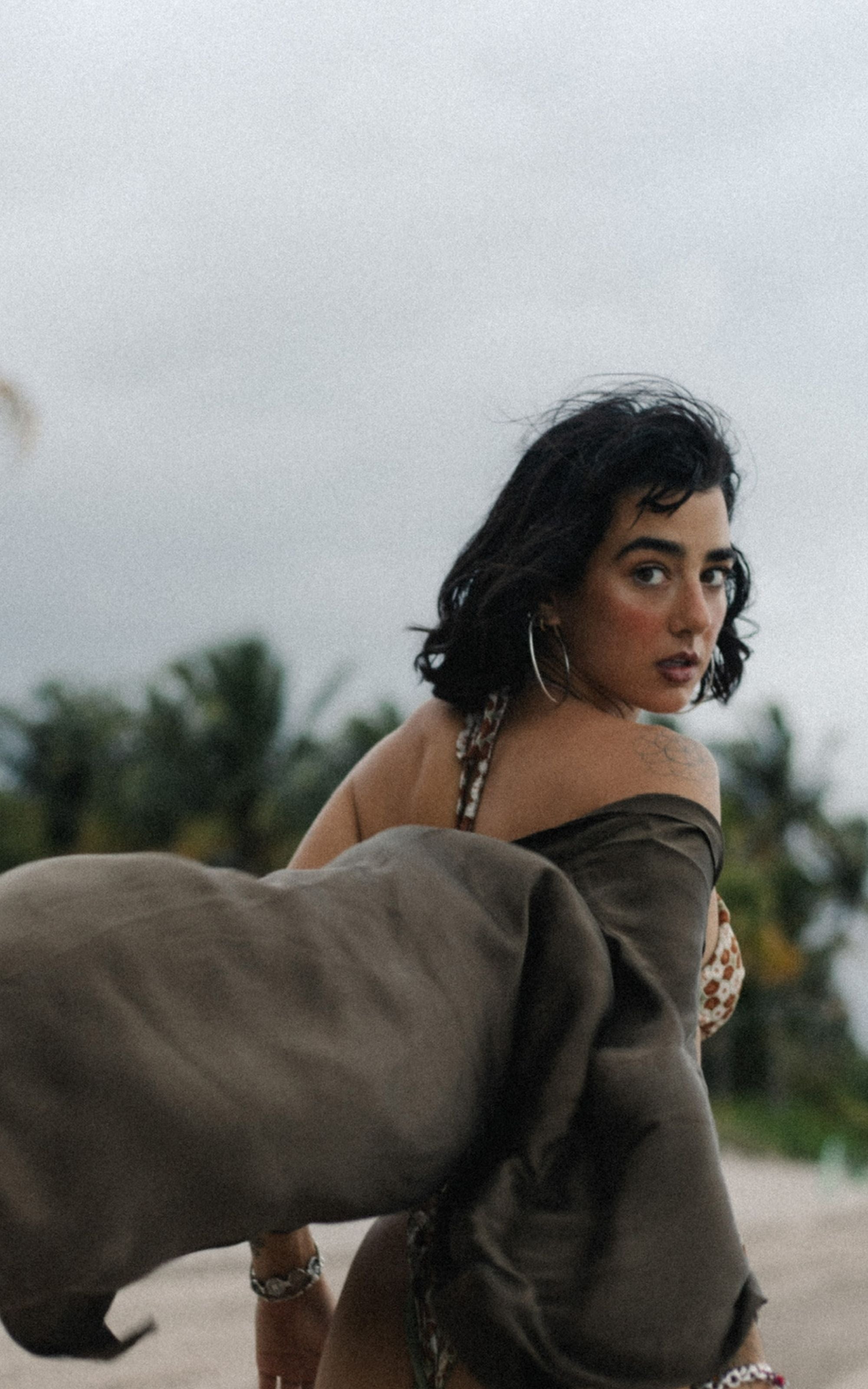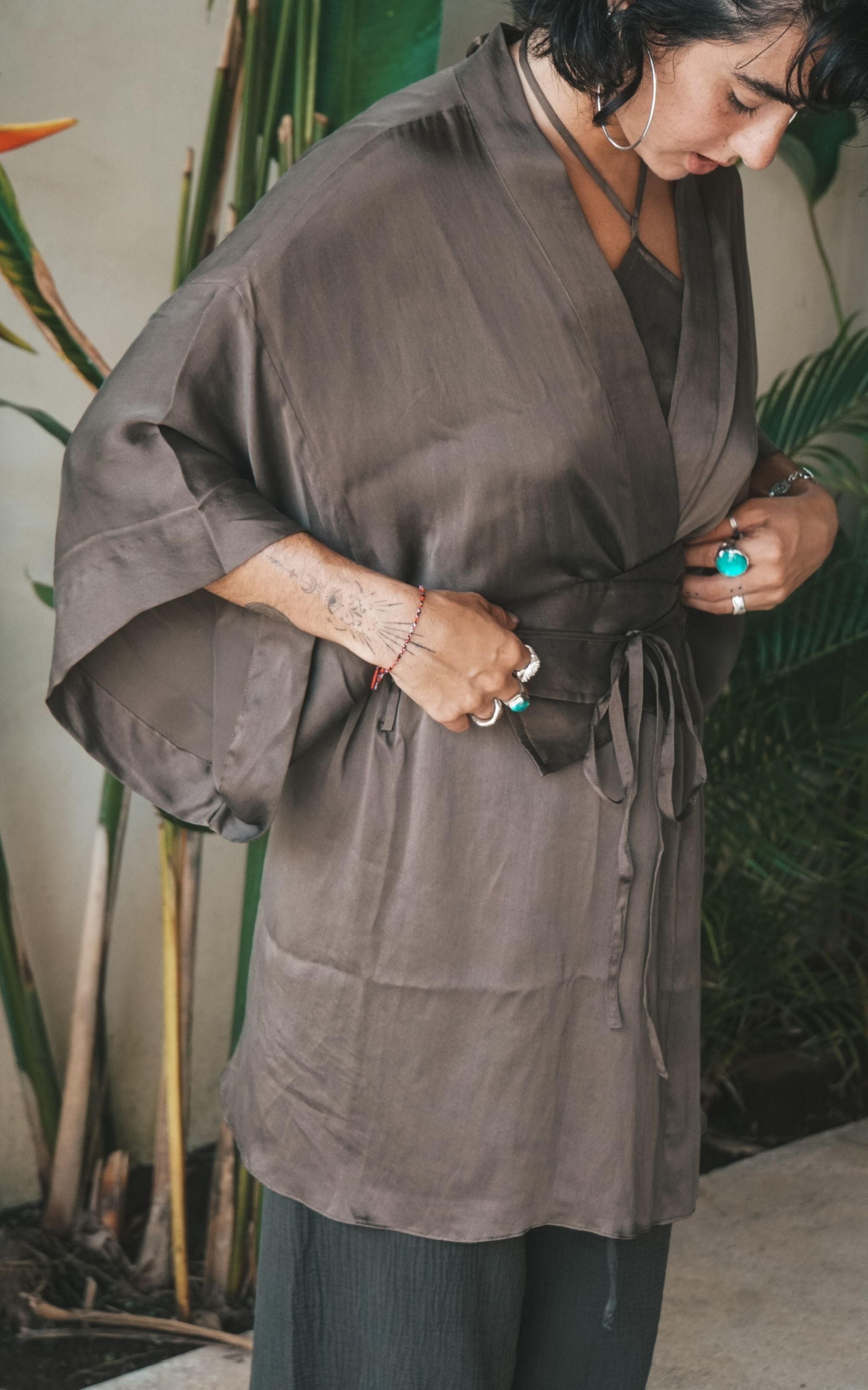 100% genuine silk satin. Oversized, one size fit. Length: 77 cm (shoulder to hem). Comes with two silk belts (obi-inspired belt + satin ribbon). Elegant and fluid, designed to be worn layered or on its own — a soft piece to lounge in and feel held in.