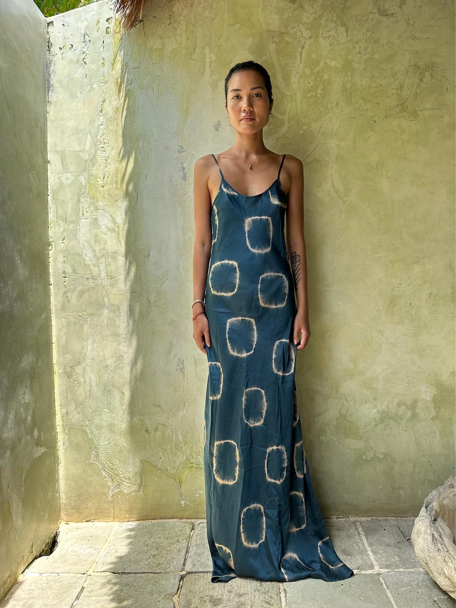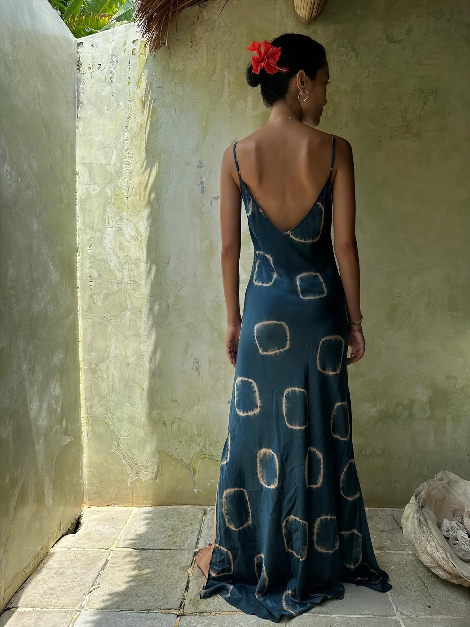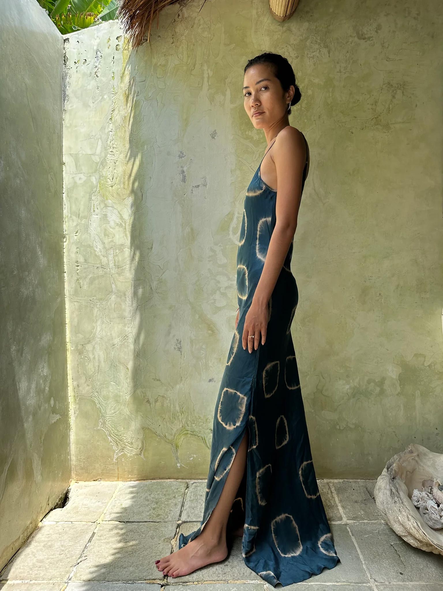 Our shibori Circle motif is made by hand, using rubber-bands and chopsticks. it takes Ibu Kadek and Ibu Ketut, 6 hours to craft our circle print motif, each circle unique and no single circle is the same. Dyed first with coconut husks and then with indigo, this silk dress is 100% plant dye and made with love.