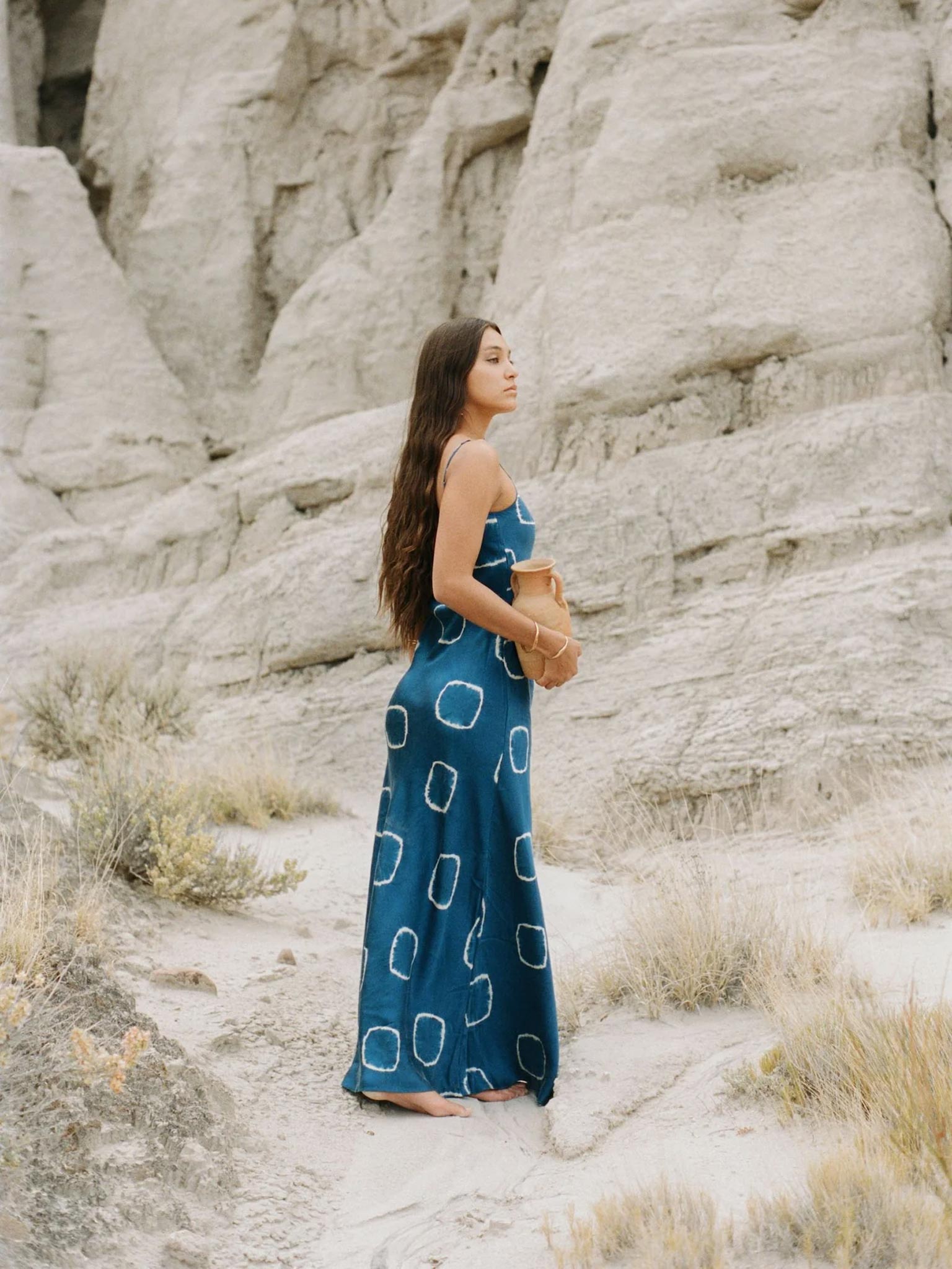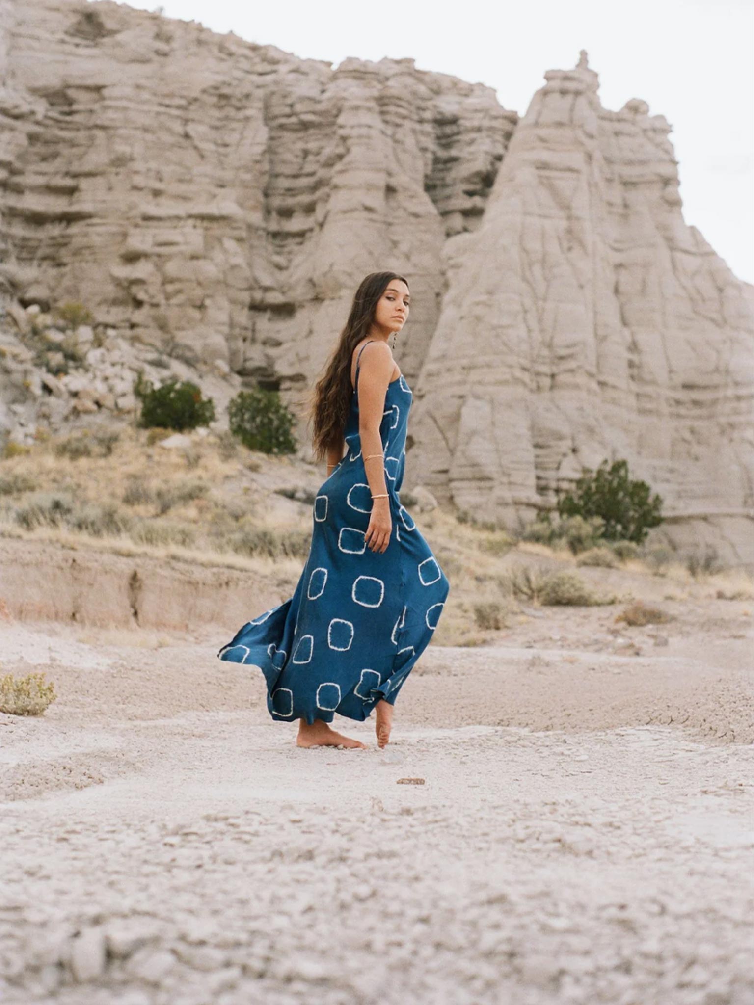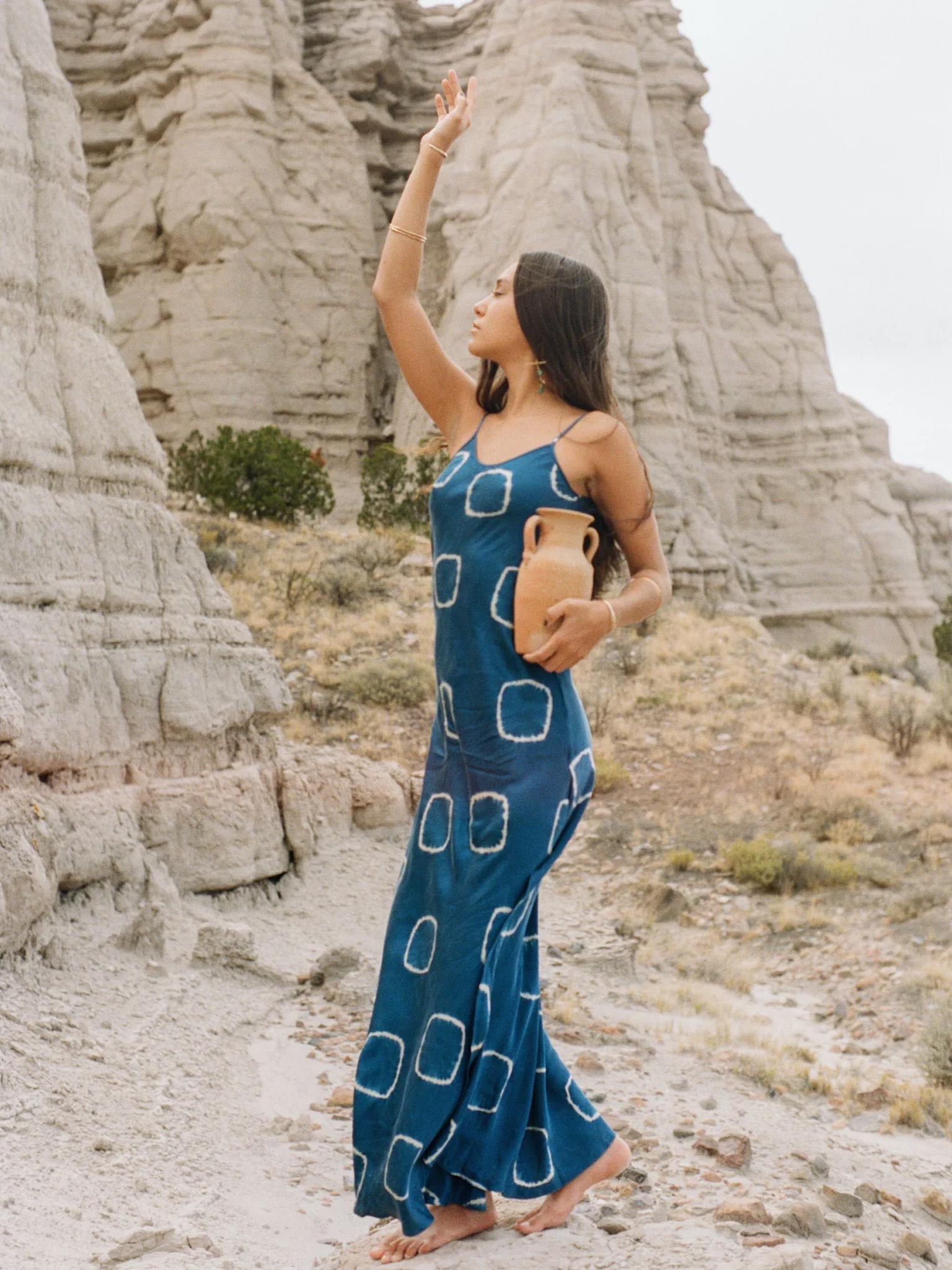 Our Scarlette Silk Dress is hand-dyed with coconut husks and indigo leaves that are grown and harvested sustainability in Indonesia. Our Indigo Silk garments supports the natural dye community of Bali and celebrates the traditional art of botanical dyes. Each plant has its own energetic wavelength and purpose. They are here to guide us in times of need. Plants like indigo, empower us to enhance our intuition and engage in self reflection.