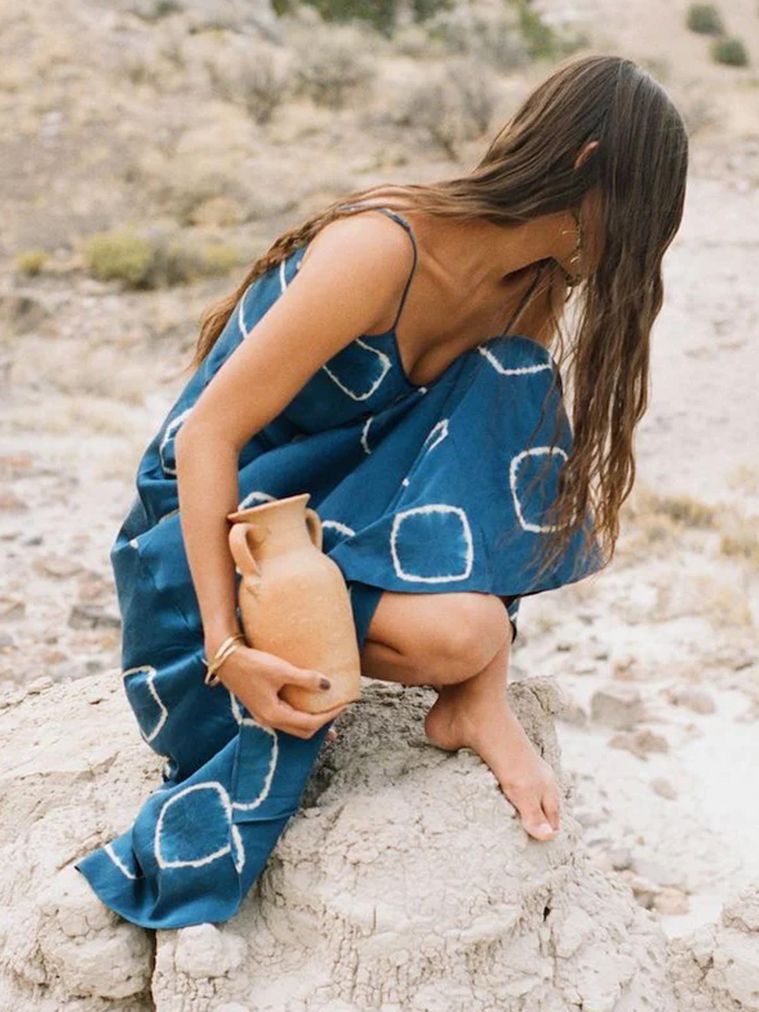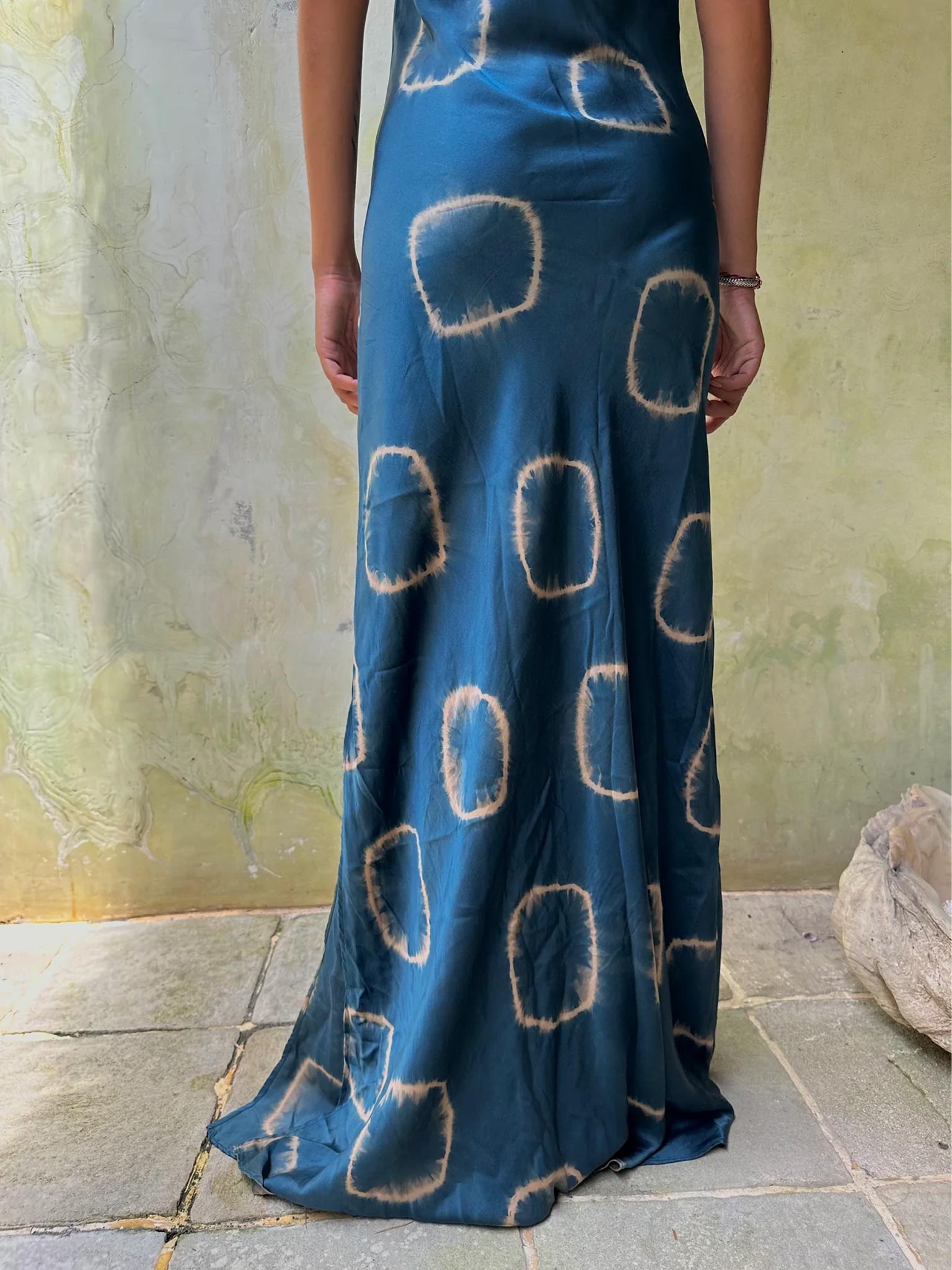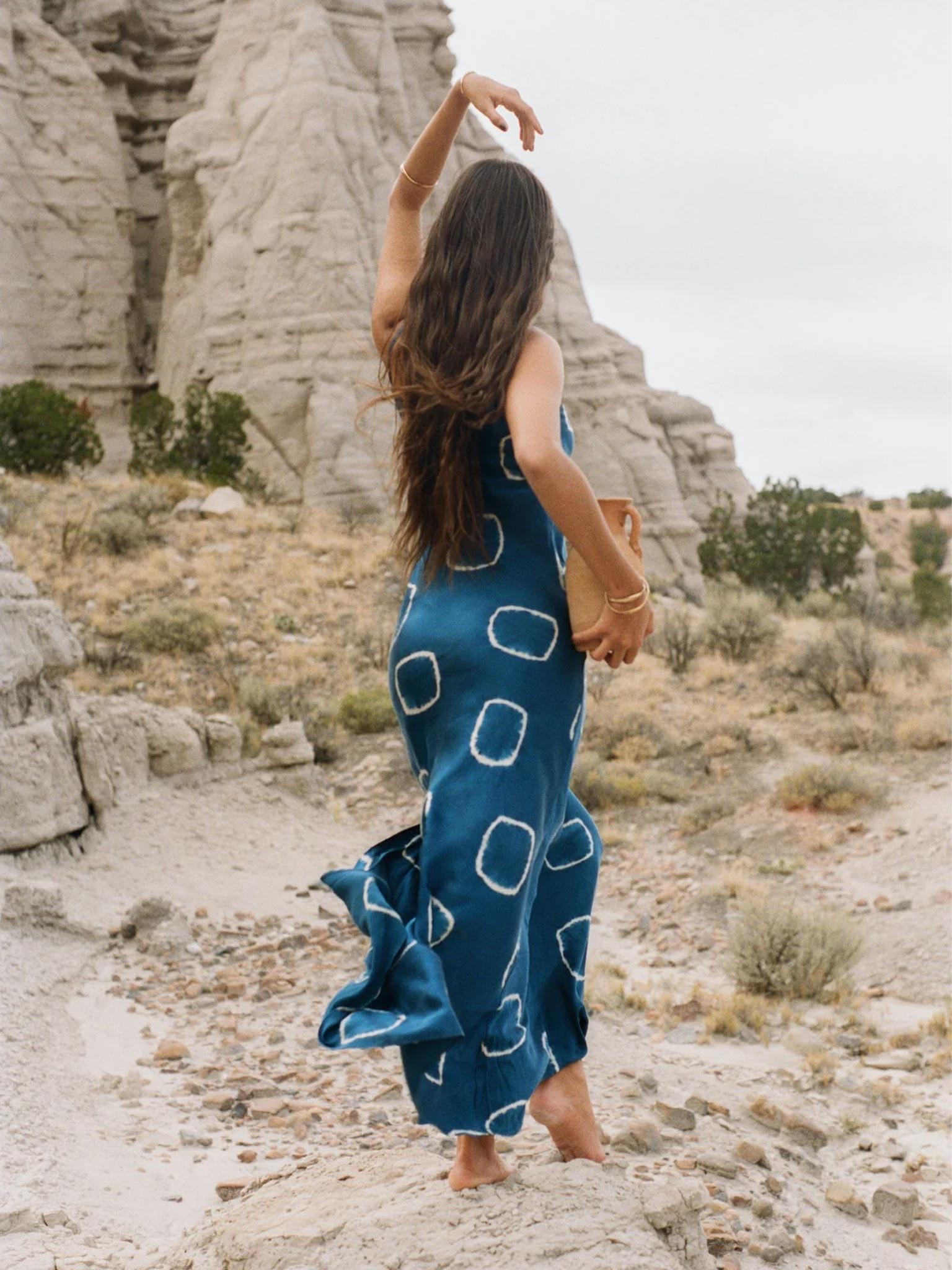 Crafted from highest quality mulberry silk, our Scarlette Silk Dress in Indigo Circle, stand as a timeless, classic staple and a versatile item in your closet.