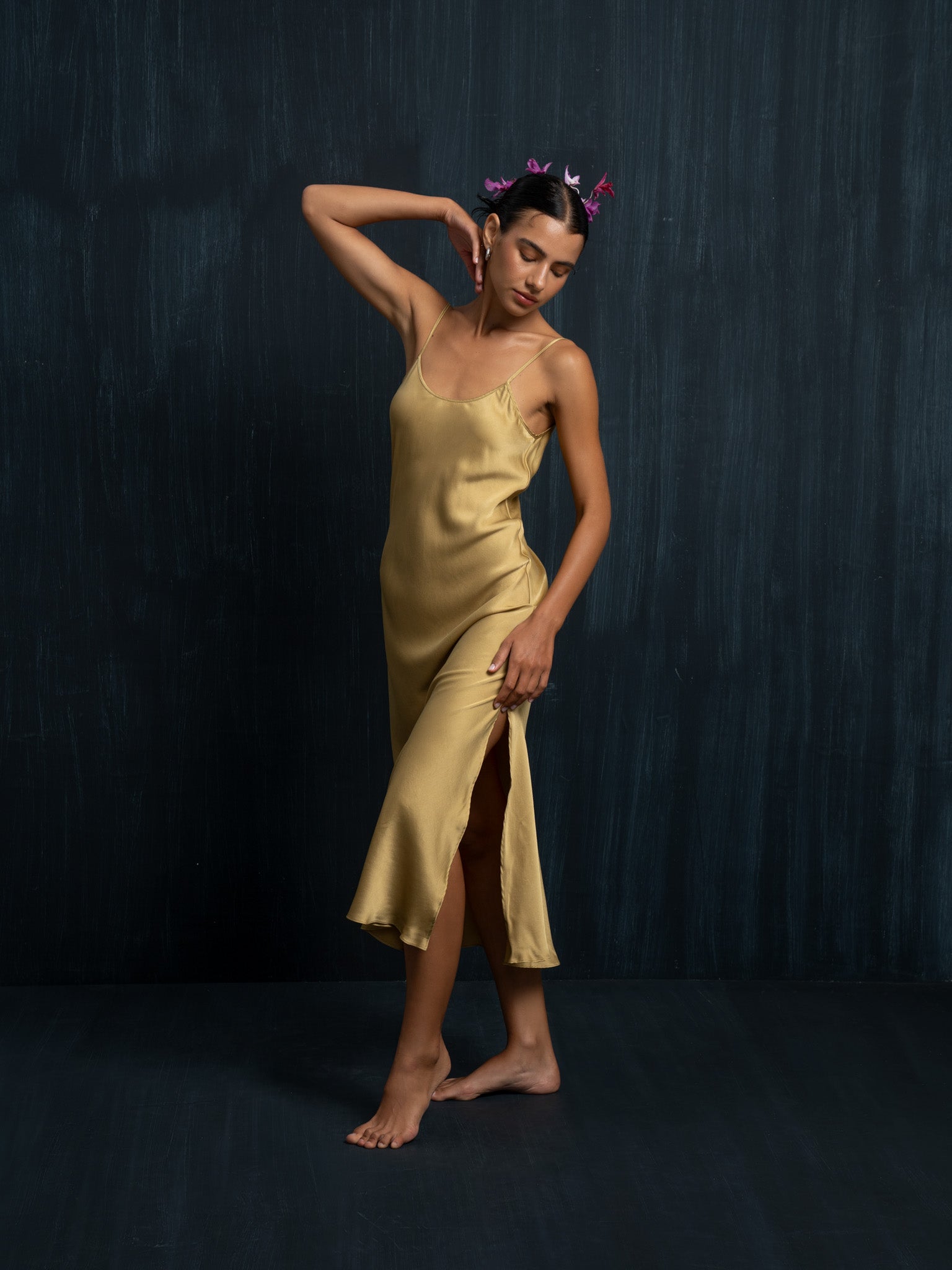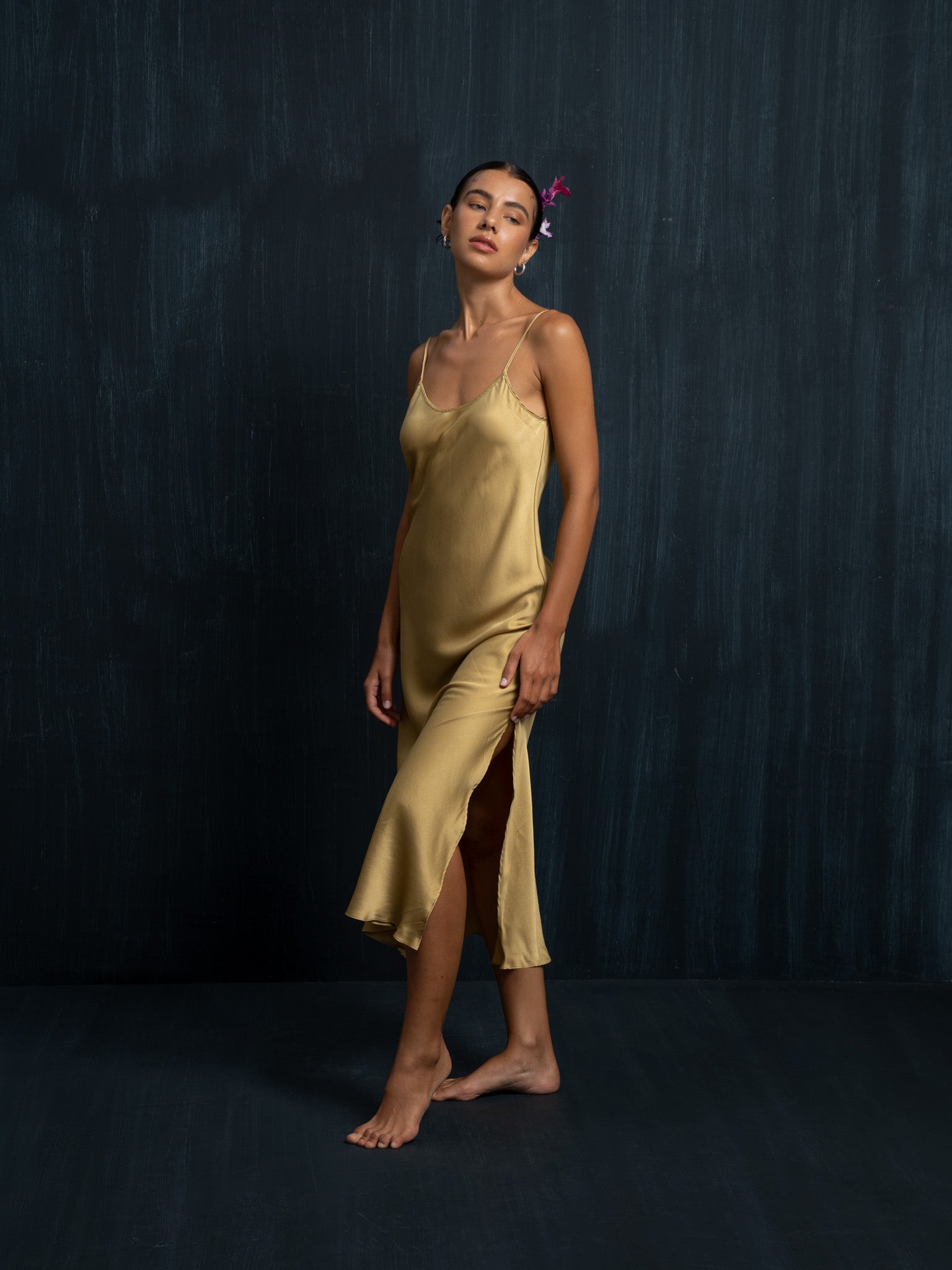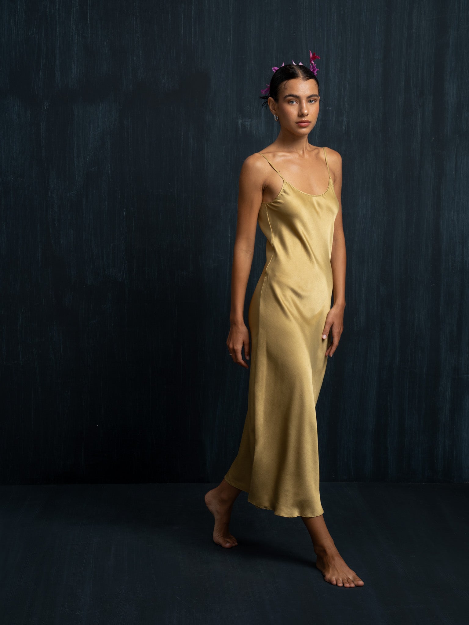 Our Scarlette Silk Dress is cut on the bias at a 45-degree angle, enhancing the natural stretch, movement, and flexibility of the silk fabric. Making the dress flattering, comfortable and drapes beautifully on all body shapes and sizes. Crafted with a classic and timeless silhouette in mind, our Scarlette Silk Dress features a U neckline, a subtly low back, adjustable straps, and a moderate side slit. The length of the midi dress, end around mid-calf, giving the overall look a modern sensibility. Ideal for both casual days and elegant evenings.