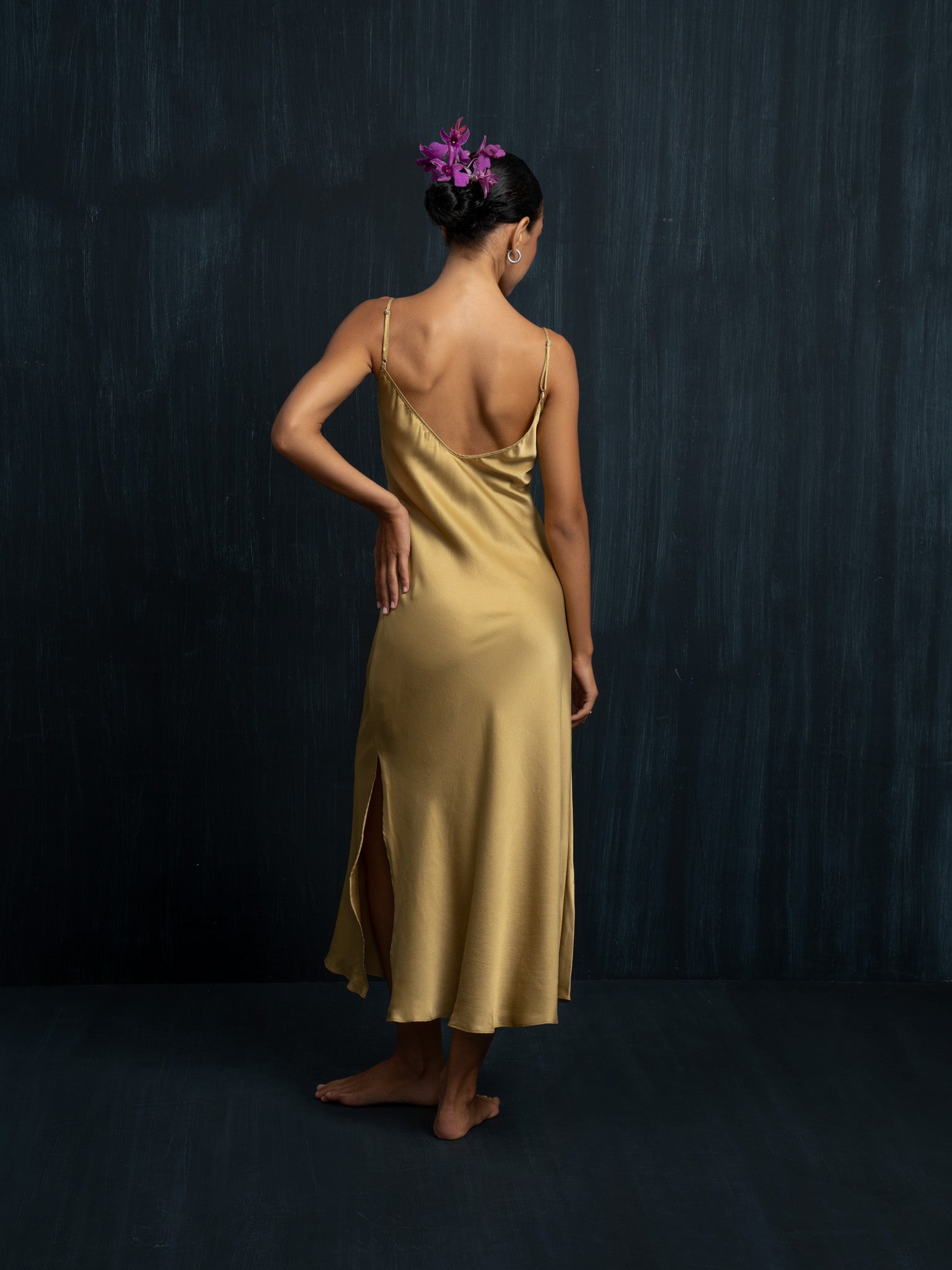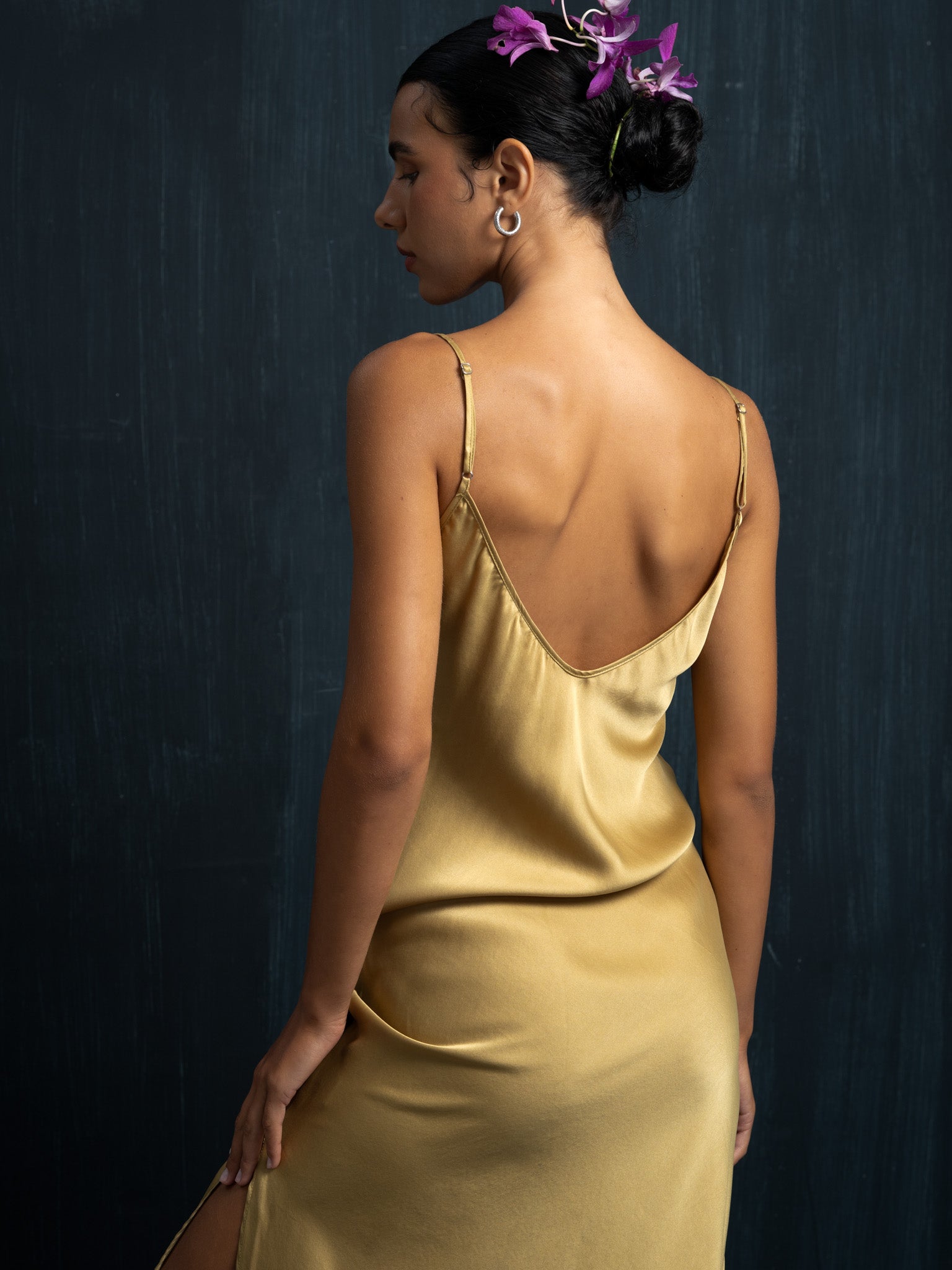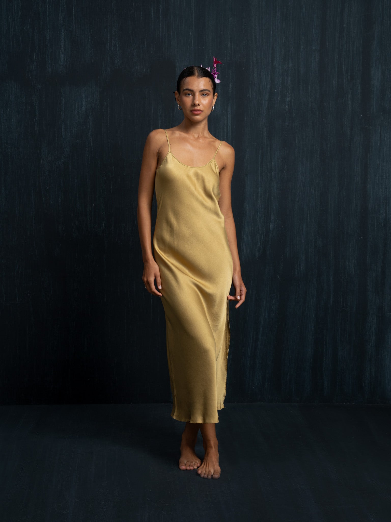 Our Scarlette Silk Dress is cut on the bias at a 45-degree angle, enhancing the natural stretch, movement, and flexibility of the silk fabric. Making the dress flattering, comfortable and drapes beautifully on all body shapes and sizes. Crafted with a classic and timeless silhouette in mind, our Scarlette Silk Dress features a U neckline, a subtly low back, adjustable straps, and a moderate side slit. The length of the midi dress, end around mid-calf, giving the overall look a modern sensibility. Ideal for both casual days and elegant evenings.
